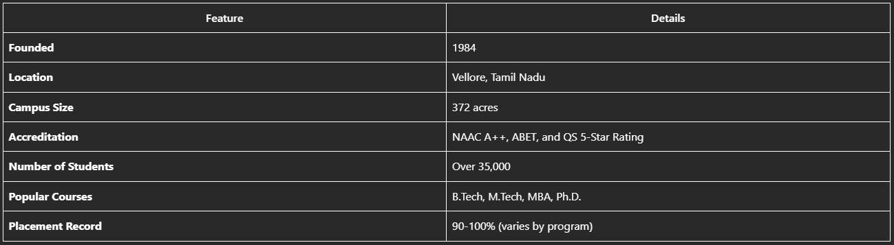 VIT Vellore was established in 1984 as Vellore Engineering College and has since evolved into a globally recognized institution. It has been ranked among the top private universities in India by various agencies, including NIRF and QS rankings. The institute is known for its innovative approach to education and strong industry connections.
