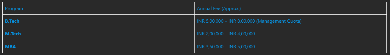 The fee structure for admission varies depending on the course and the quota under which the student is applying. Below is an estimated fee structure: