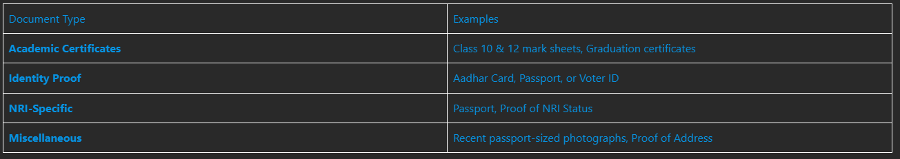 For NRI candidates, a valid passport and proof of NRI status are mandatory.