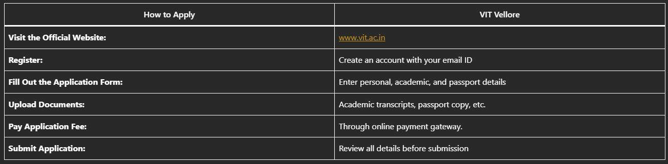 The admission process at VIT Vellore is straightforward and involves the following steps:
